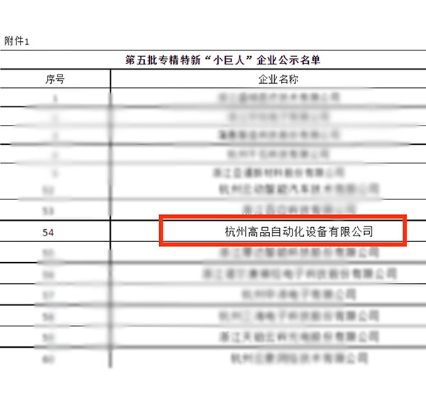 根據(jù)工信部統(tǒng)一部署,7月14日,浙江省經(jīng)信廳發(fā)布了《關(guān)于浙江省第五批專精特新“小巨人”企業(yè)和第二批專精特新“小巨人”復核通過企業(yè)名單的公示》。根據(jù)公示,全省共有384家企業(yè)新入圍第五批專精特新“小巨人”企業(yè)名單,其中杭州企業(yè)117家,位居全省第一。杭州高品自動化設(shè)備有限公司榜上有名!